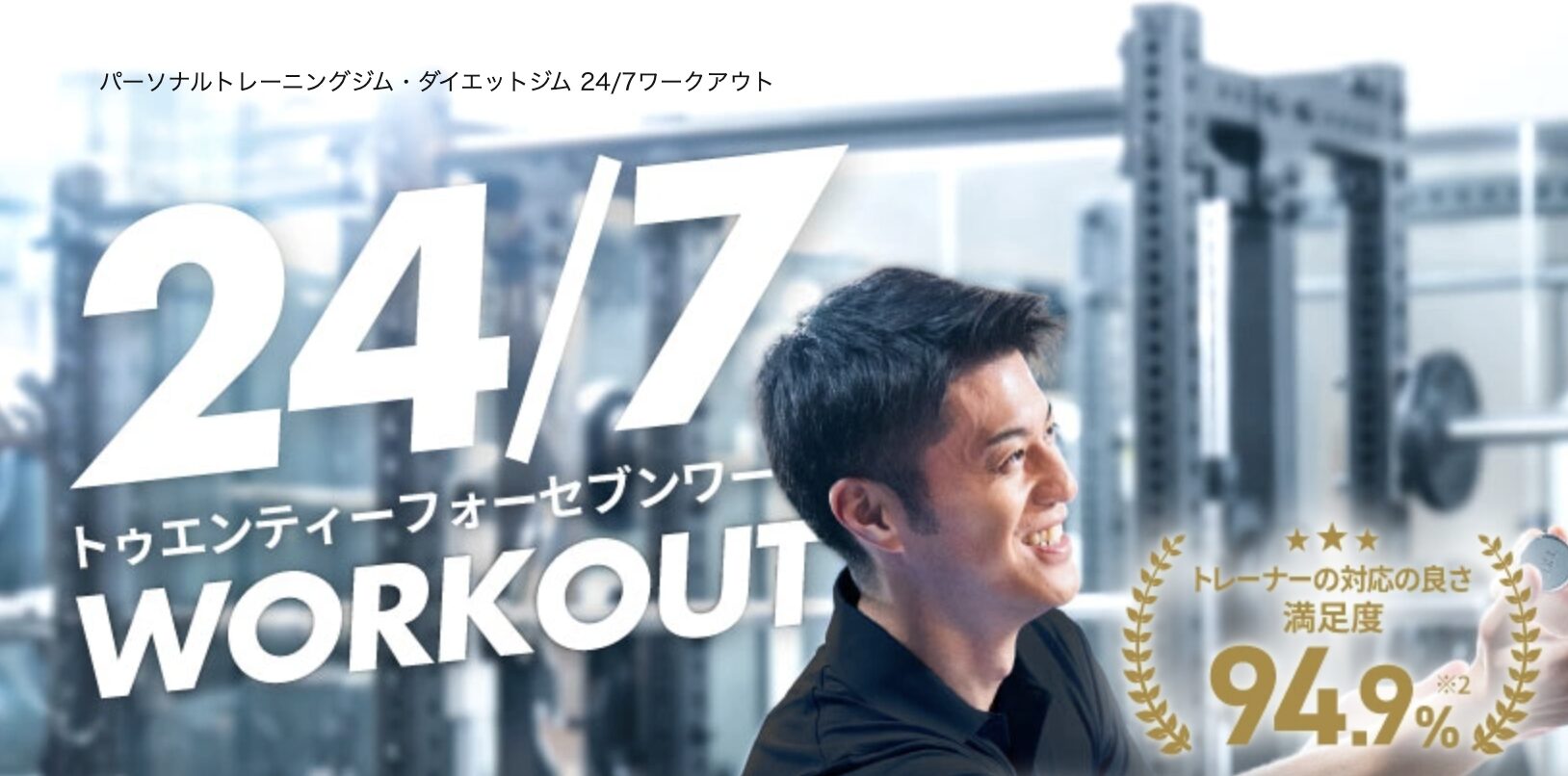 24/7ワークアウトは、業界No.1の営業時間の長さと「3食食べるダイエット」が特徴のパーソナルジムです。朝7時から夜24時まで営業しているため、出勤前や残業後でも通いやすく、ビジネスパーソンを中心に高い支持を得ています。完全個室で他人の目を気にせず集中できる環境も魅力です。