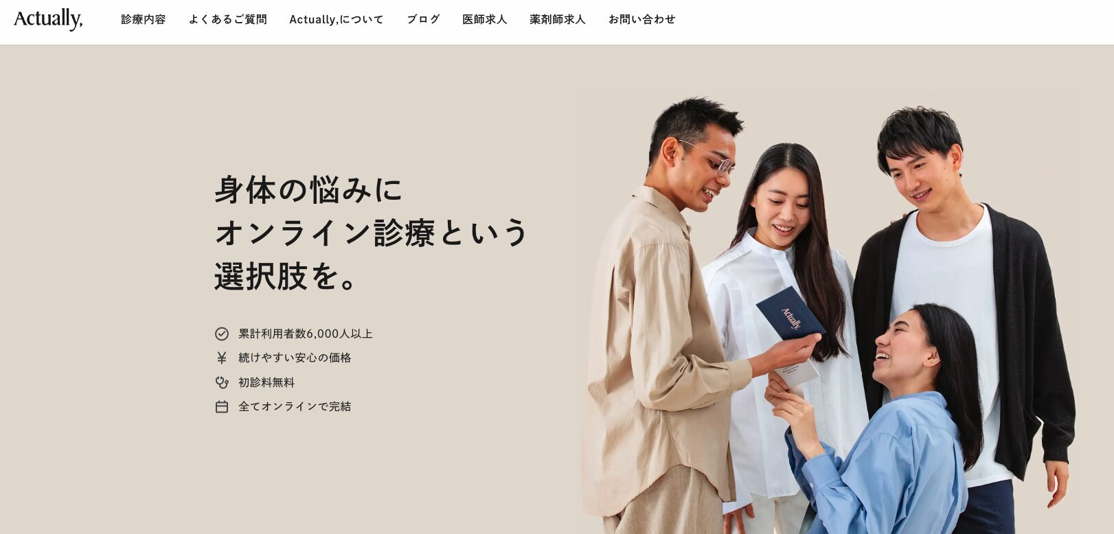 Actuallyは、スマートフォン一台で診療から薬の受け取りまで完結する、次世代型オンライン完結のニキビ治療サービスです。
